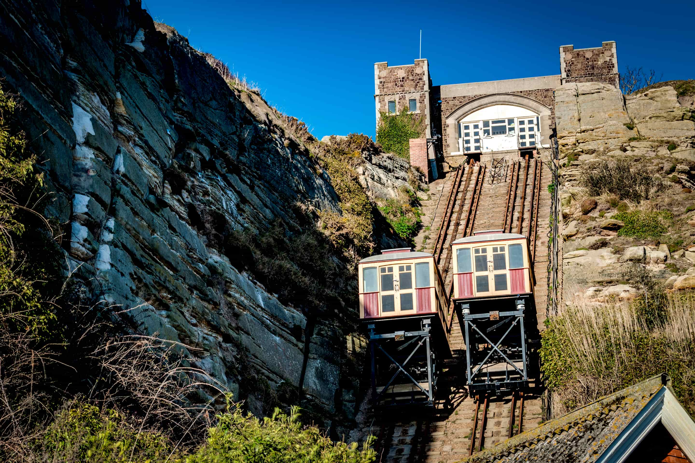 Hastings East Hill Railway is a funicular railway that avoids a walk up the steep West hill between the town and the views and cafe on top. It’s historic too, and a much more enjoyable way of getting up or down than the paths! Funiculars have operated in Europe since 1862, and in Britain since 1875. It's one of two funicular railways in Hastings.